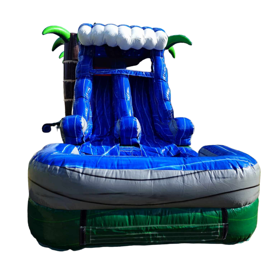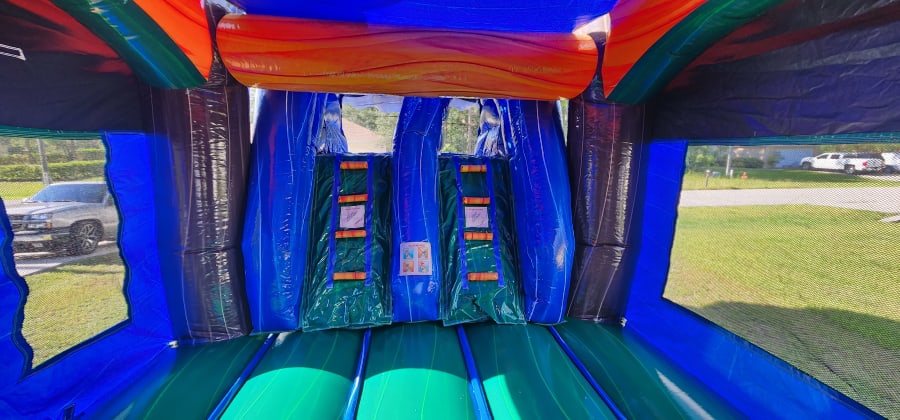 Our Monsoon Madness Large Combo with Pool is designed with safety and excitement in mind. The bounce house features a spacious jumping area where kids can bounce to their heart's content. The dual slides offer a thrilling ride down, while the large pool at the bottom provides a refreshing splash landing.